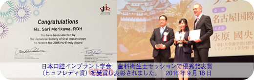| 2016年9月16日 | 公益社団法人 日本口腔インプラント学会に歯科衛生士の森川紗里、富久藍子、阪本勇紀が参加しました。 森川紗里が歯科衛生士セッションで優秀発表賞(ヒュフレディ賞)を受賞し表彰されました。 また最優秀発表賞を院長の阪本貴司が受賞しました。 |