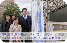 | 2016年11月20日 | 京都市で開催された口腔リハビリテーション学会で当院歯科衛生士の富久藍子が発表しました。 |