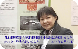 | 2017年5月12日 | 福岡にて開催された第60回春季日本歯周病学会に当院歯科衛生士の富久藍子がポスター発表を行いました。 日本歯周病学会の認定歯科衛生士試験に当院歯科衛生士の富久藍子が合格しました。 |